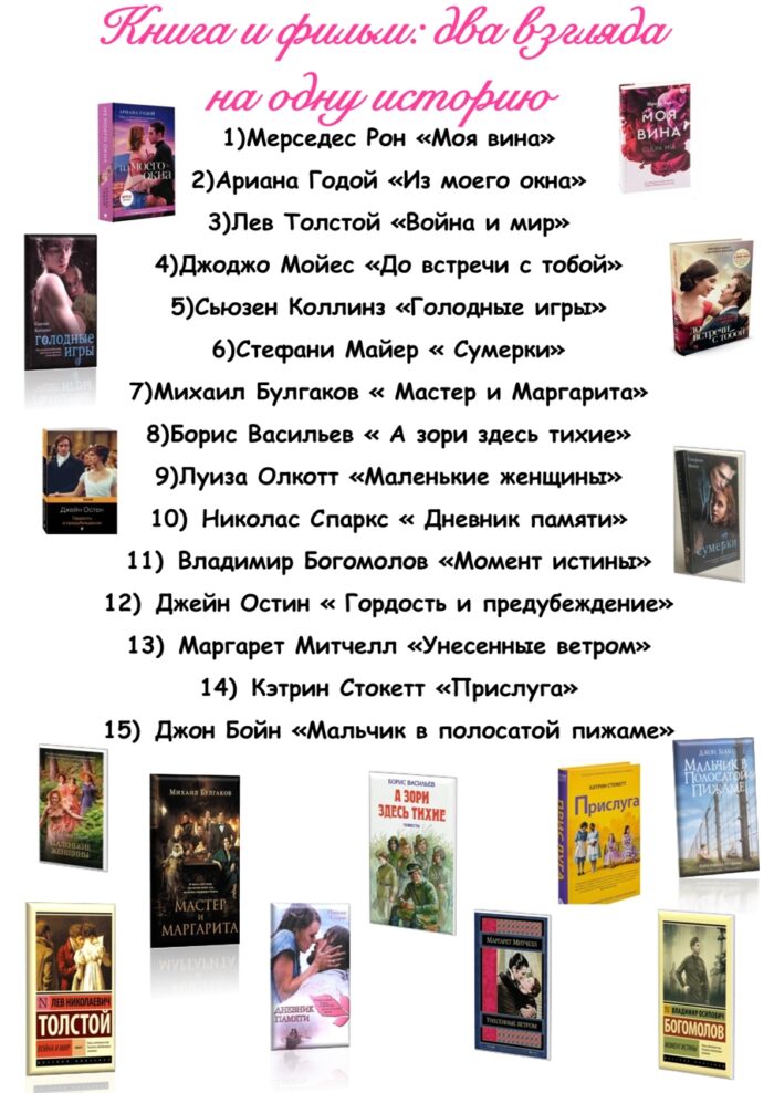 Результатом опроса стал шорт-лист «Книга и фильм: два взгляда на одну историю», включивший 15 самых популярных книг у наших читателей, которые они захотели прочесть, увидев их экранизацию.